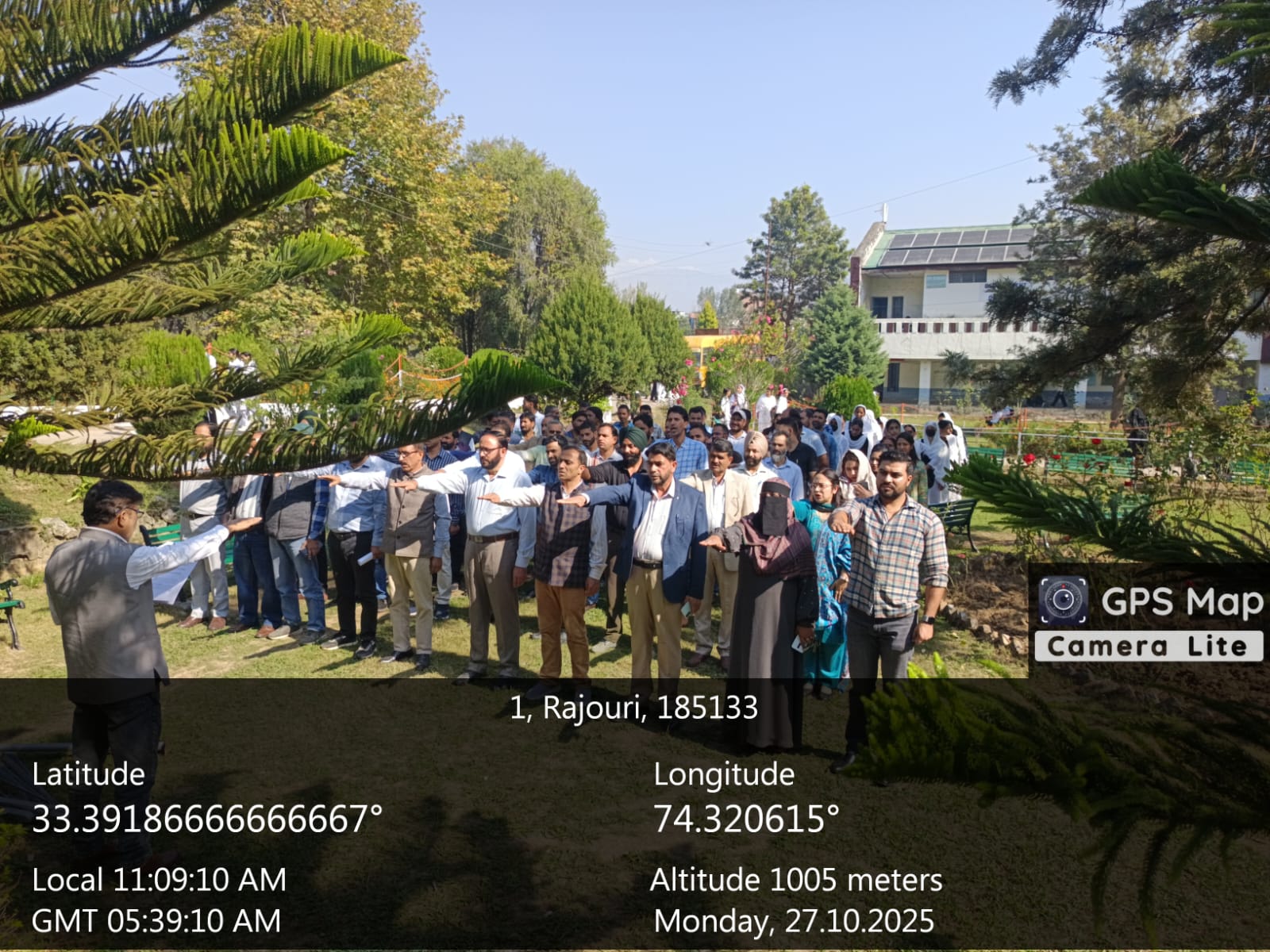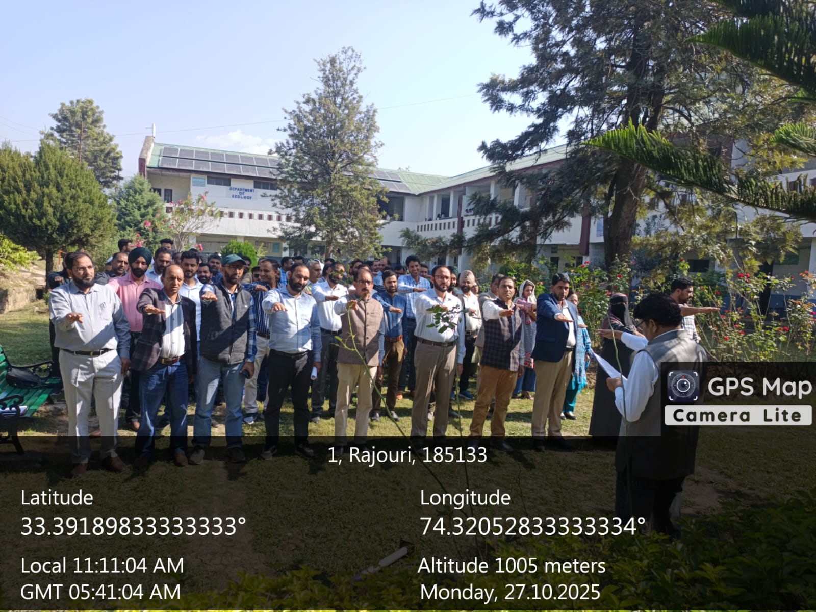 In observance of Observes Administered pledge in connection with observance of Vigilance Awareness Week 2025 the Government Post Graduate College, Rajouri, administered a pledge ceremony in the College today on 27 th of Oct. 2025. Prof. Zamir Ahmed Mirza, Principal of the College, in his address highlighted the importance of regarding vigilance awareness. He stressed upon all to have a corruption free society. The pledge was read by Dr. Zakir Hussain Kalis HOD English. All the staff members (teaching, Non-teaching and local fun employees) were present in the pledge ceremony.
