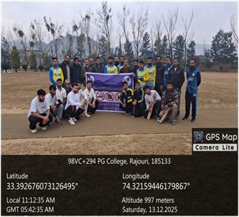 Date:26-02-2020 3rd Day on Going Inter Colligate Sports Festival at Govt. P.G College Rajouri. Results Cricket Semifinal 1) GDC Rajouri beats GDC Sunderbani by five wickets 2) GDC Budhalbeats GDC Nowshera win by one wicket. Kabbaid Semifinal 1) GDC Rajouri beats GDC Sunderbani by 10 points Volleyball Final (Men) 1) GDC Rajouri WinnerGDC Darhal by Runner Volleyball Final (Women) 1) GDC NowhseraWinner GDC Rajouri by Runner Badminton Final (women) 1) GDC SunderbaniWinner GDC Rajouri Runner Badminton Final (Men) 1) GDC NowsheraWinner GDC SunderbaniRunner KhoKhoSemifinal(Women) 1) GDC Nowshera beats GDC Sunderbani Tug of War Semifinal (Men) 1. GDC Koteranka beats GDC Thannamandi 2-1 2. GDC Rajouri beats GDC Nowshera 2-1 Tug of War Semifinal (Women) 1) GDC Nowshera beats GDC Sunderbani by 2-1 The festival was under the supervision of Sh. RakeshPuri and Sh. Tanwir AhmedDeptt. Of Physical Education Govt. P.G. College Rajouri20 officials of Department of Youth Services and Sports lead by Sh. WaliMohdChowdhary Zonal Physical Officer.